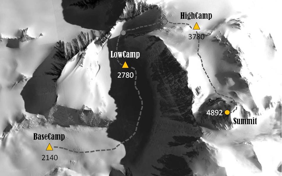 Ik heb een gedetailleerde kaart van ‘Reise Know-How’ (Antarktis) met prikkers aan de muur hangen. Als een grote witte verfvlek te midden van het blauwe water van de Zuidelijk Oceaan domineert dit enorme continent de hele poster. Het herinnert me elke dag weer aan het mooie avontuur dat er aan komt. Een cirkel markeert het Ellsworth gebergte, vernoemd naar Lincoln Ellsworth die er in 1935 overheen vloog en deze toppen op de kaart zette. Het noordelijke gedeelte staat bekend als het Sentinel gebergte en het zuidelijke stuk als het Heritage gebergte. Mount Vinson bevindt zich in het noordelijke stuk en wordt meestal via de Branscomb gletsjer aangelopen. Onze expeditie zal diezelfde route (Branscomb Shoulder Route) volgen die er in grote lijnen als volgt uitziet: